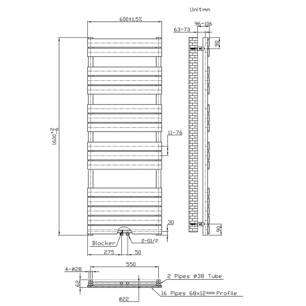 HANDDOEKRADIATOR MIDDEN AANSLUITING, 1600X600, 908W, WIT